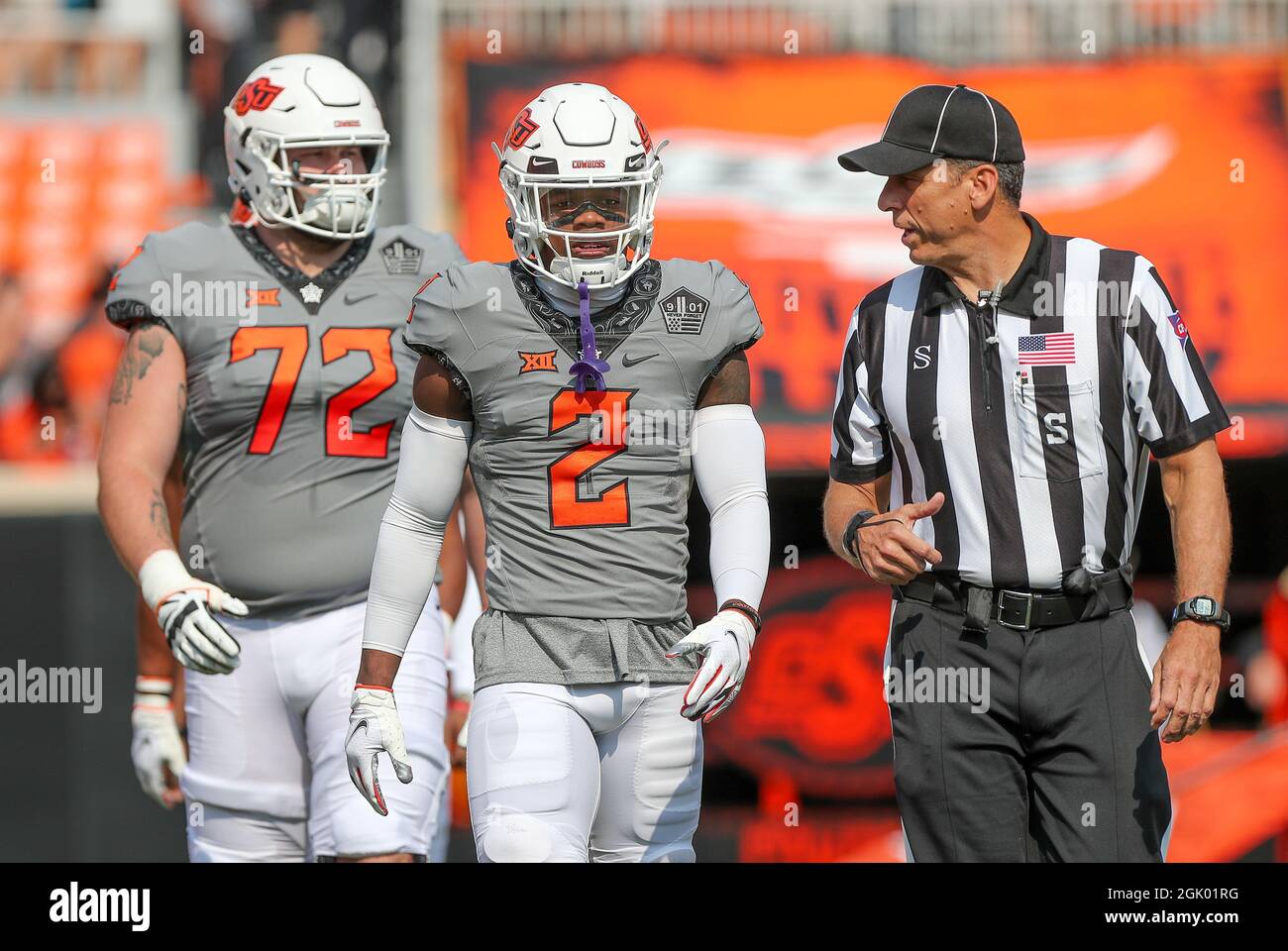 Stillwater Ok Usa September 2021 Die Oklahoma State Captains Josh Sills 72 Und Tanner Mccalister 2 Vor Einem Fussballspiel Zwischen Dem Tulsa University Golden Windhauch Und Den Oklahoma State Cowboys Im Boone